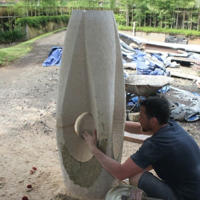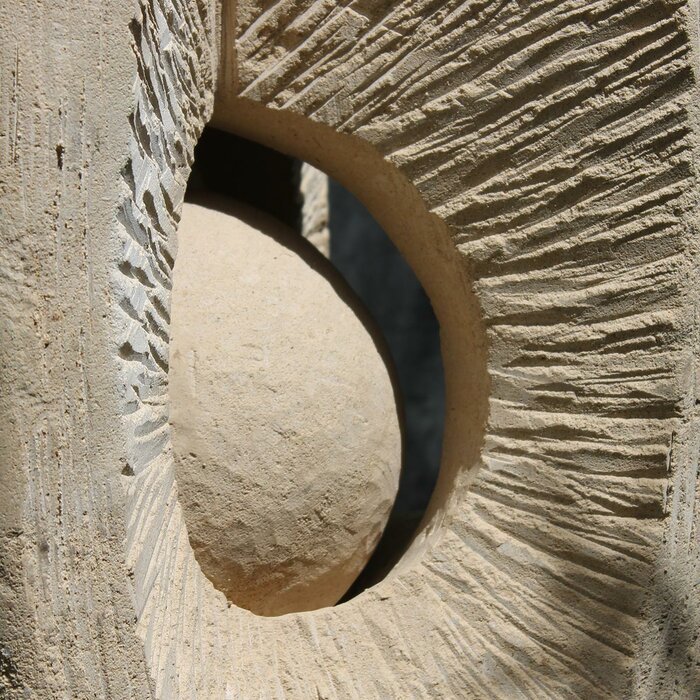 This sculpture was created in just two weeks on the Indonesian island of Bali. It was carved on site from a local block of stone using simple tools. One particularly playful feature of the sculpture is its rotating sphere.