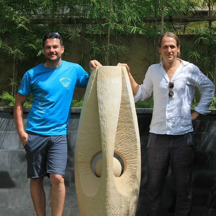 This sculpture was created in just two weeks on the Indonesian island of Bali. It was carved on site from a local block of stone using simple tools. One particularly playful feature of the sculpture is its rotating sphere.