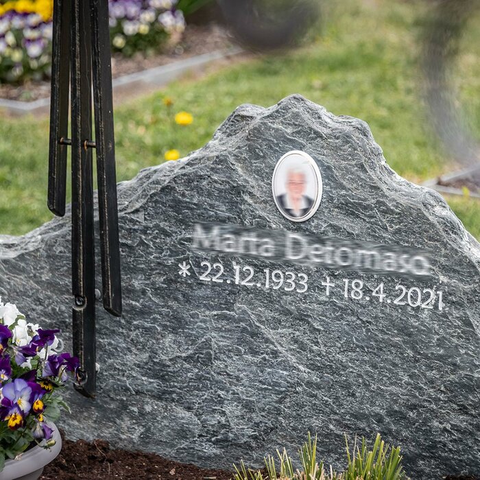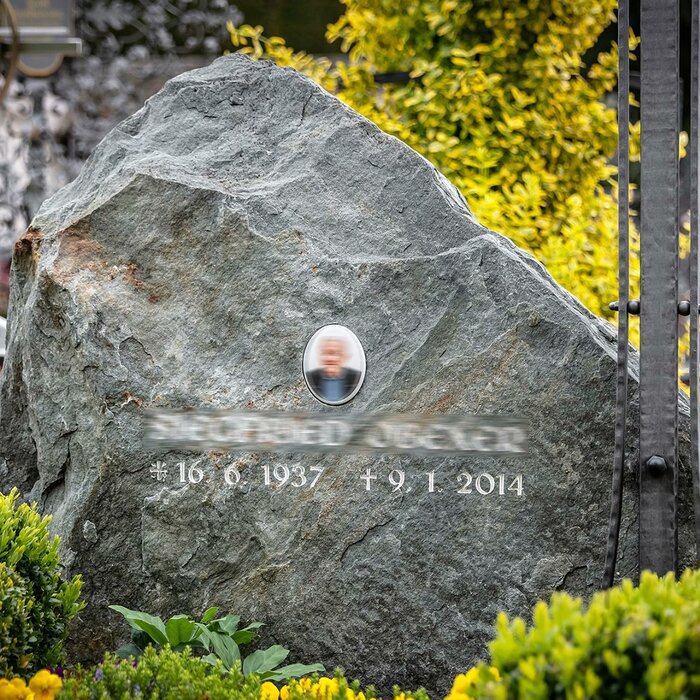 The shape of the natural stone and the matching inscription give a gravestone its unmistakable appearance. The lettering plays a key role in the design.